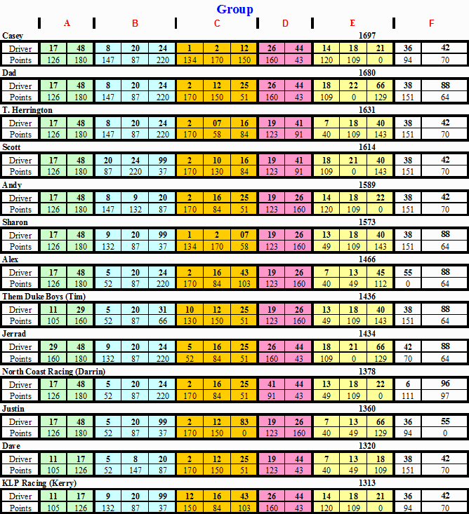 | 10 | North Coast Racing (Darrin) | 1,378 | -319 |