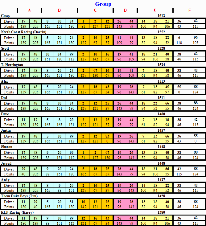 | 2 | North Coast Racing (Darrin) | 1,552 | -60 |