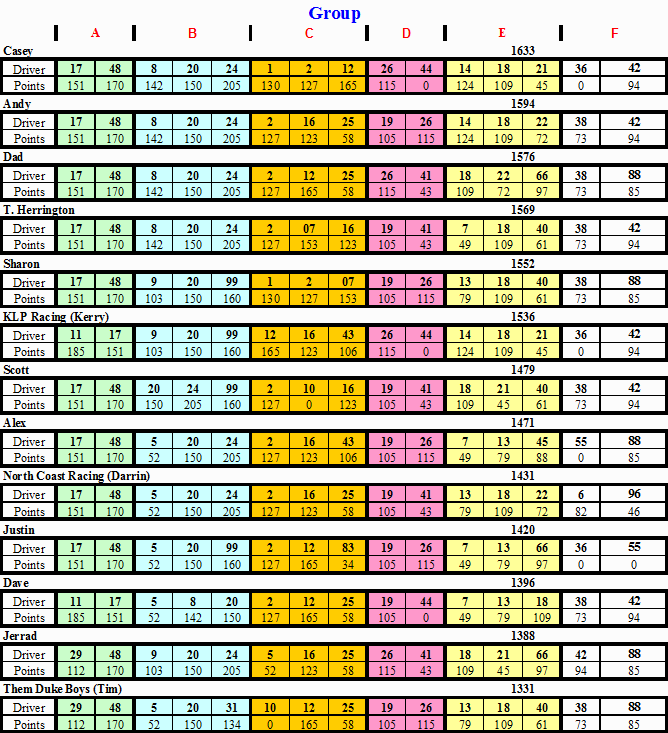 | 12 | Them Duke Boys (Tim) | 15,112 | -1,735 | ||||