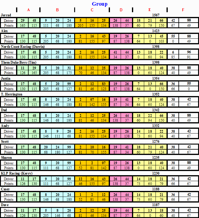 | 3 | North Coast Racing (Darrin) | 1,398 | -169 |