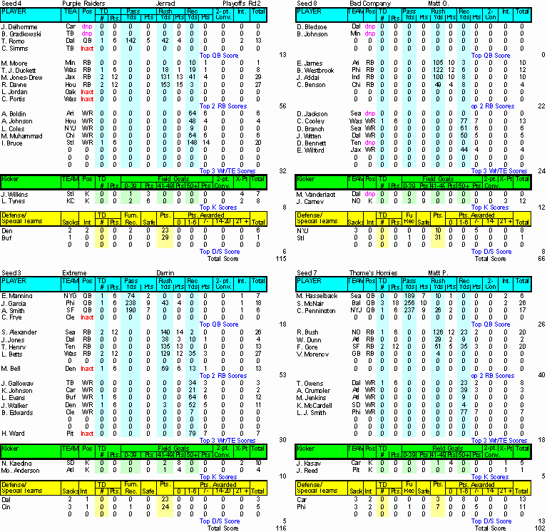 Home ] Up ] Week 1 ] Week 2 ] Week 3 ] Week 4 ] Week 5 ] Week 6 ] Week 7 ] Week 8 ] Week 9 ] Week 10 ] Week 11 ] Week 12 ] Week 13 ] Week 14 ] Playoffs Rd 1 ] [ Playoff Rd 2 ]