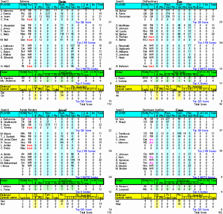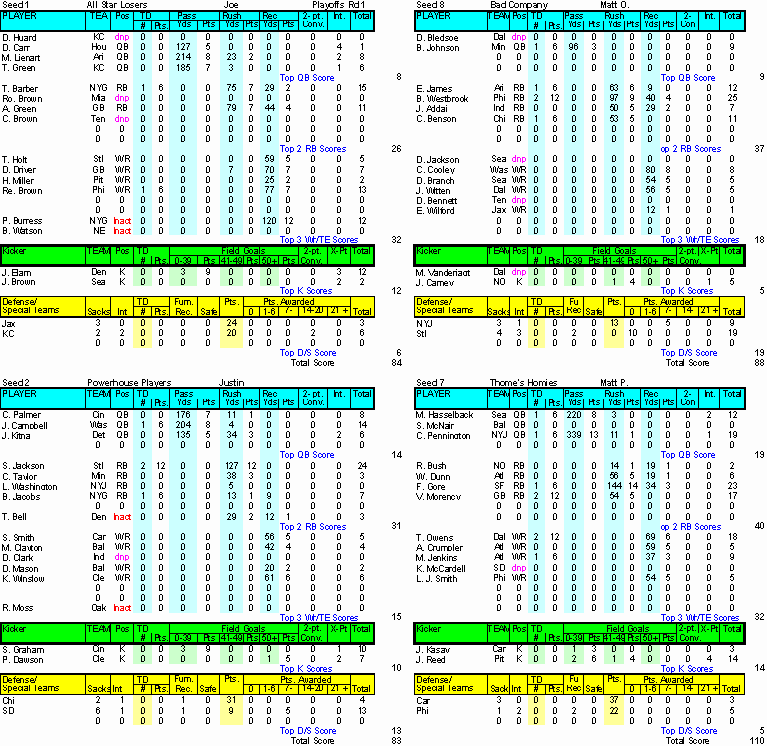 [ Home ] [ Up ] [ Week 1 ] [ Week 2 ] [ Week 3 ] [ Week 4 ] [ Week 5 ] [ Week 6 ] [ Week 7 ] [ Week 8 ] [ Week 9 ] [ Week 10 ] [ Week 11 ] [ Week 12 ] [ Week 13 ] [ Week 14 ] [ Playoffs Rd 1 ] [ Playoff Rd 2 ]