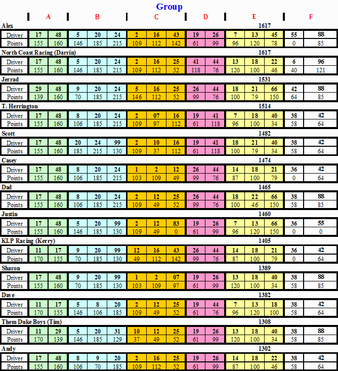 | 1 | North Coast Racing (Darrin) | 1,617 | |