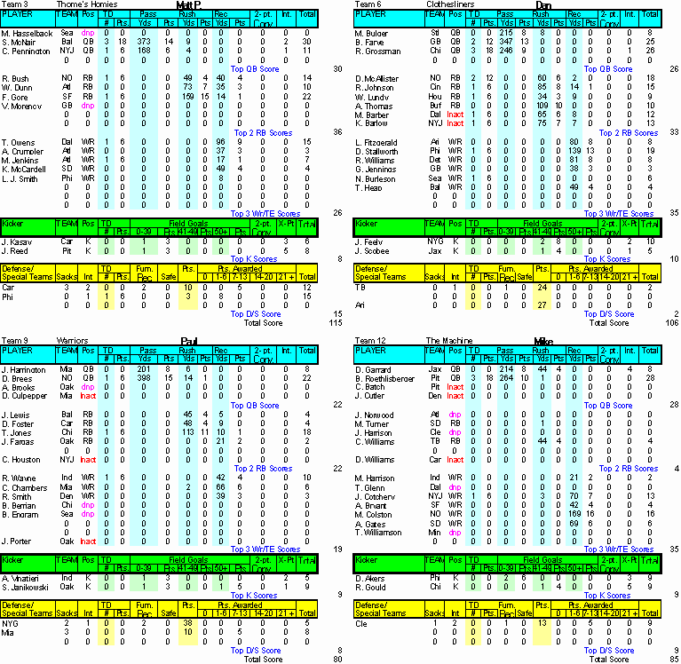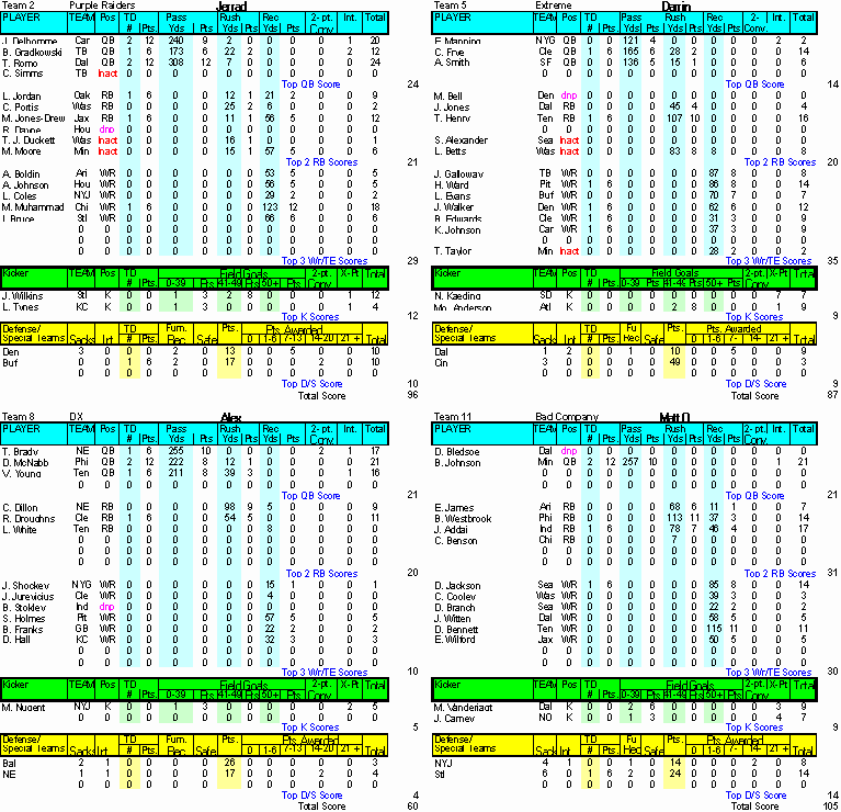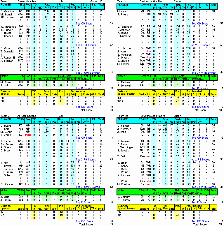 Home ] Up ] Week 1 ] Week 2 ] Week 3 ] Week 4 ] Week 5 ] Week 6 ] Week 7 ] Week 8 ] Week 9 ] [ Week 10 ] Week 11 ] Week 12 ] Week 13 ] Week 14 ] Playoffs Rd 1 ] Playoff Rd 2 ]