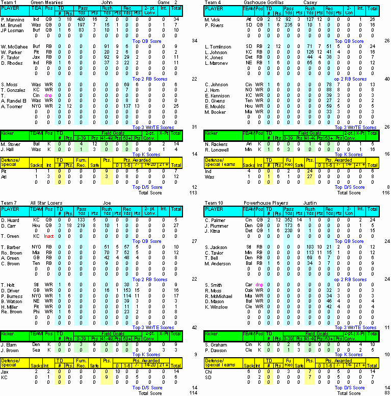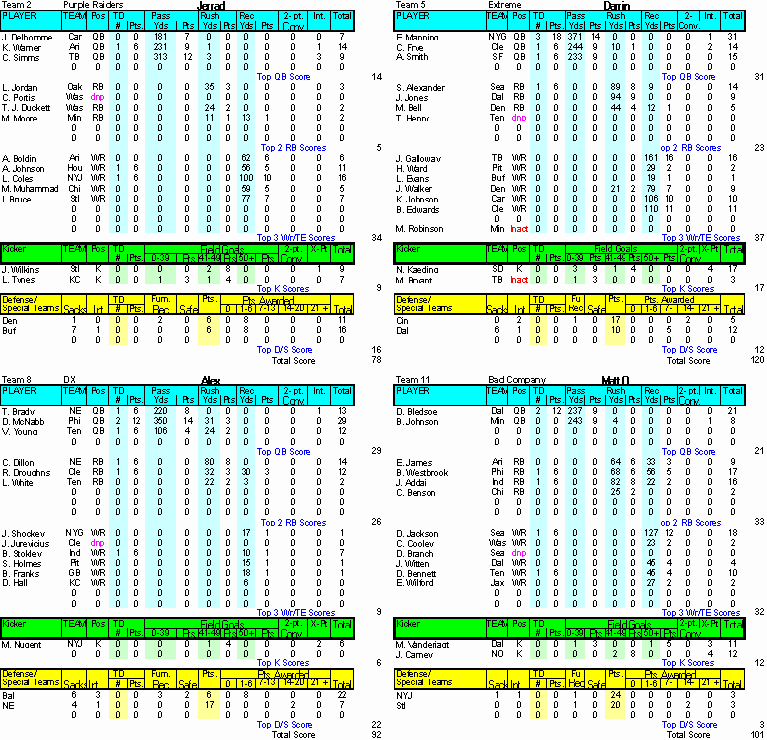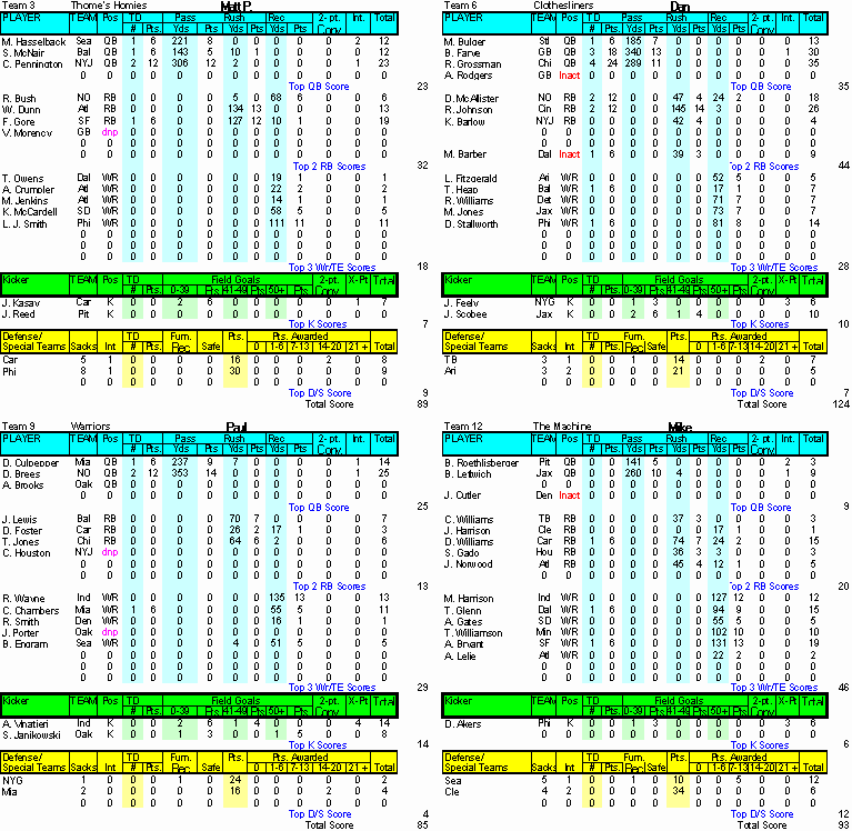 Home ] Up ] Week 1 ] [ Week 2 ] Week 3 ] Week 4 ] Week 5 ] Week 6 ] Week 7 ] Week 8 ] Week 9 ] Week 10 ] Week 11 ] Week 12 ] Week 13 ] Week 14 ] Playoffs Rd 1 ] Playoff Rd 2 ]