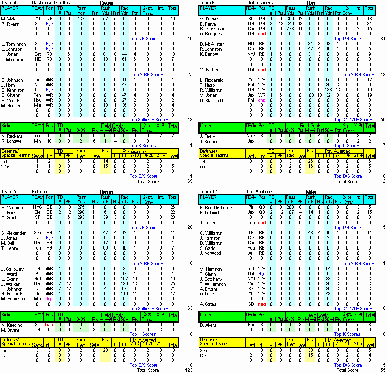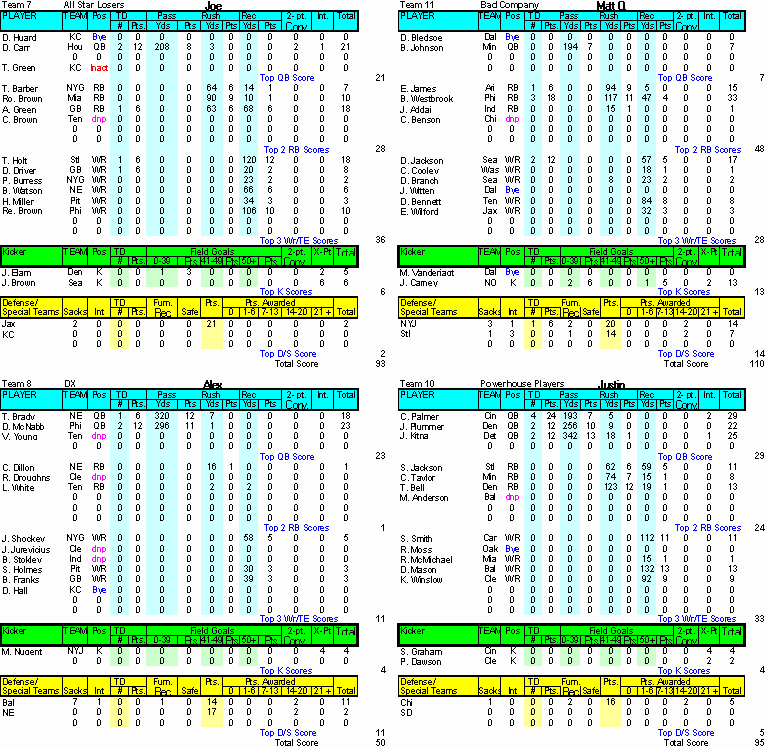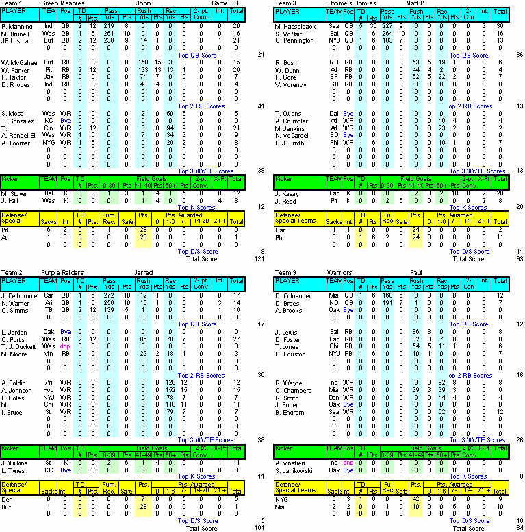 Home ] Up ] Week 1 ] Week 2 ] [ Week 3 ] Week 4 ] Week 5 ] Week 6 ] Week 7 ] Week 8 ] Week 9 ] Week 10 ] Week 11 ] Week 12 ] Week 13 ] Week 14 ] Playoffs Rd 1 ] Playoff Rd 2 ]
