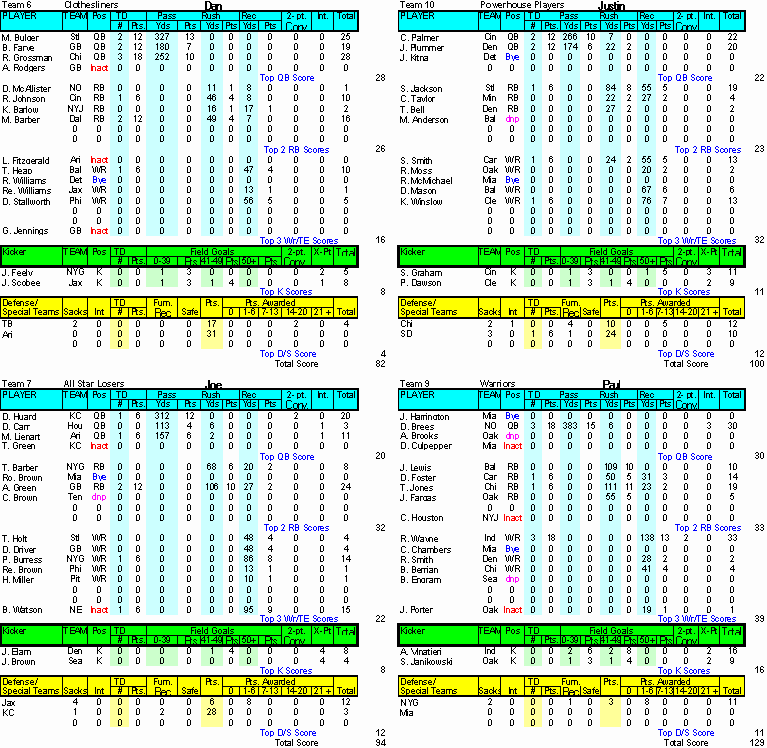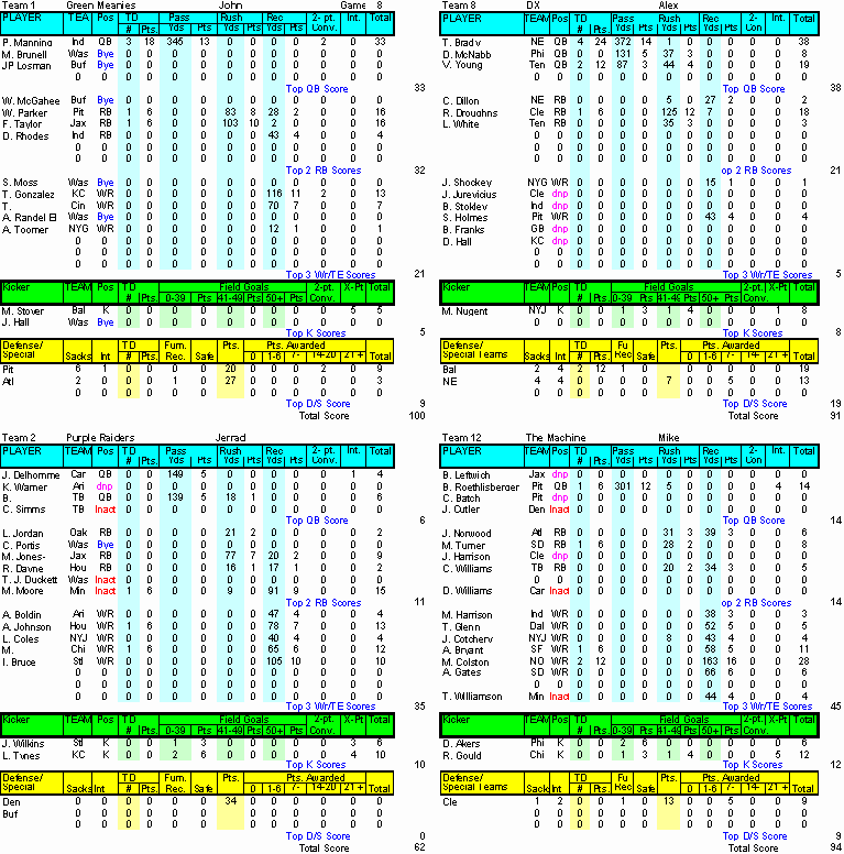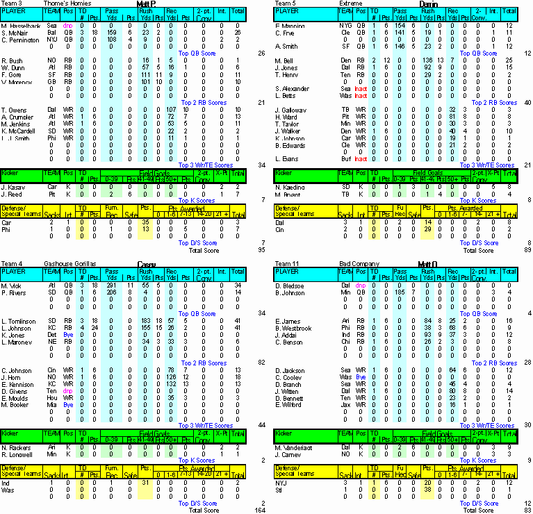 Home ] Up ] Week 1 ] Week 2 ] Week 3 ] Week 4 ] Week 5 ] Week 6 ] Week 7 ] [ Week 8 ] Week 9 ] Week 10 ] Week 11 ] Week 12 ] Week 13 ] Week 14 ] Playoffs Rd 1 ] Playoff Rd 2 ]