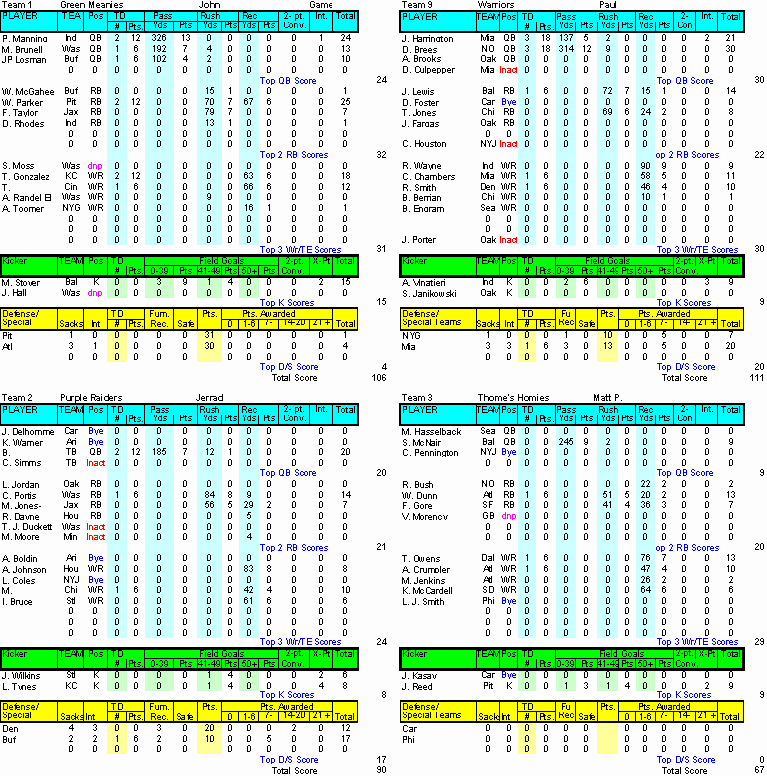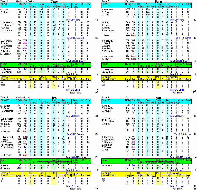 Home ] Up ] Week 1 ] Week 2 ] Week 3 ] Week 4 ] Week 5 ] Week 6 ] Week 7 ] Week 8 ] [ Week 9 ] Week 10 ] Week 11 ] Week 12 ] Week 13 ] Week 14 ] Playoffs Rd 1 ] Playoff Rd 2 ]